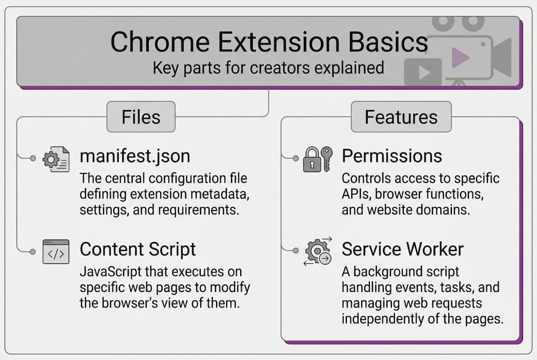 Core components include the service worker for background logic, content scripts that inject code into pages, and the popup or options UI that you interact with directly. For video tools, this architecture is what allows an extension to access your screen, activate your microphone, or inject a recording toolbar into any page you visit.